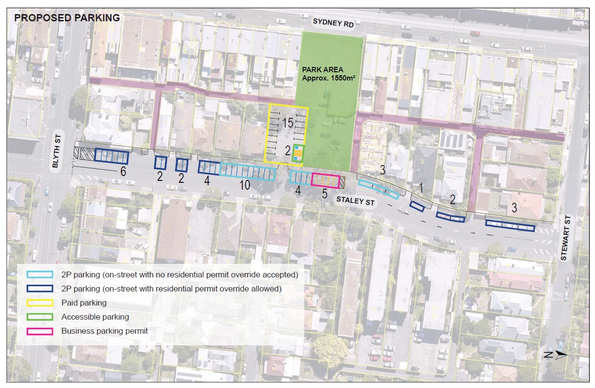 • Increases local parking capacity by reconfiguring the Staley Street layout, acknowledging the high value the community places on car park access.