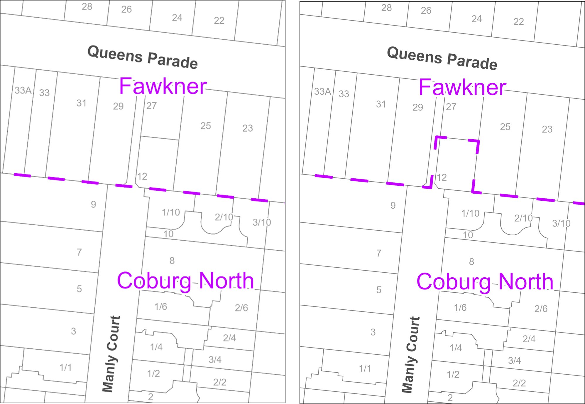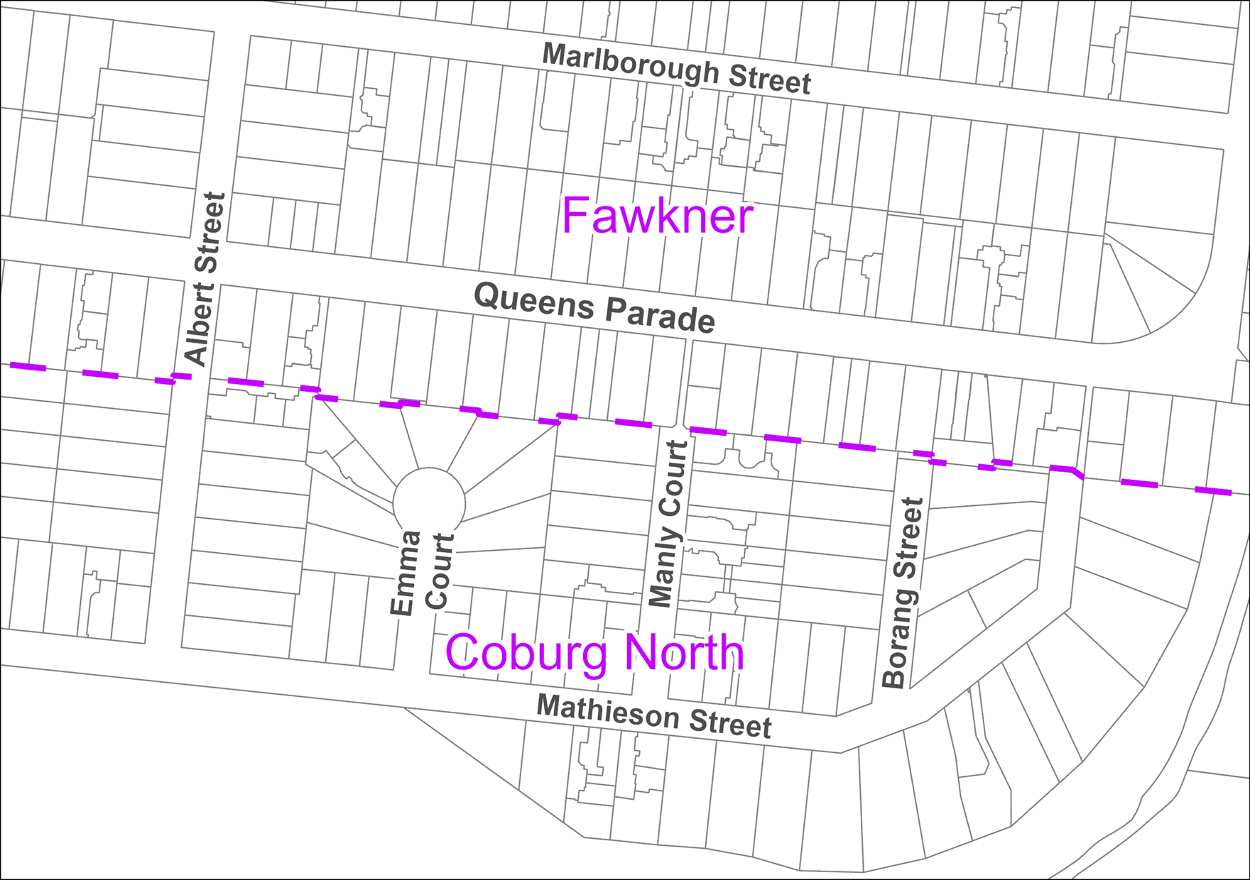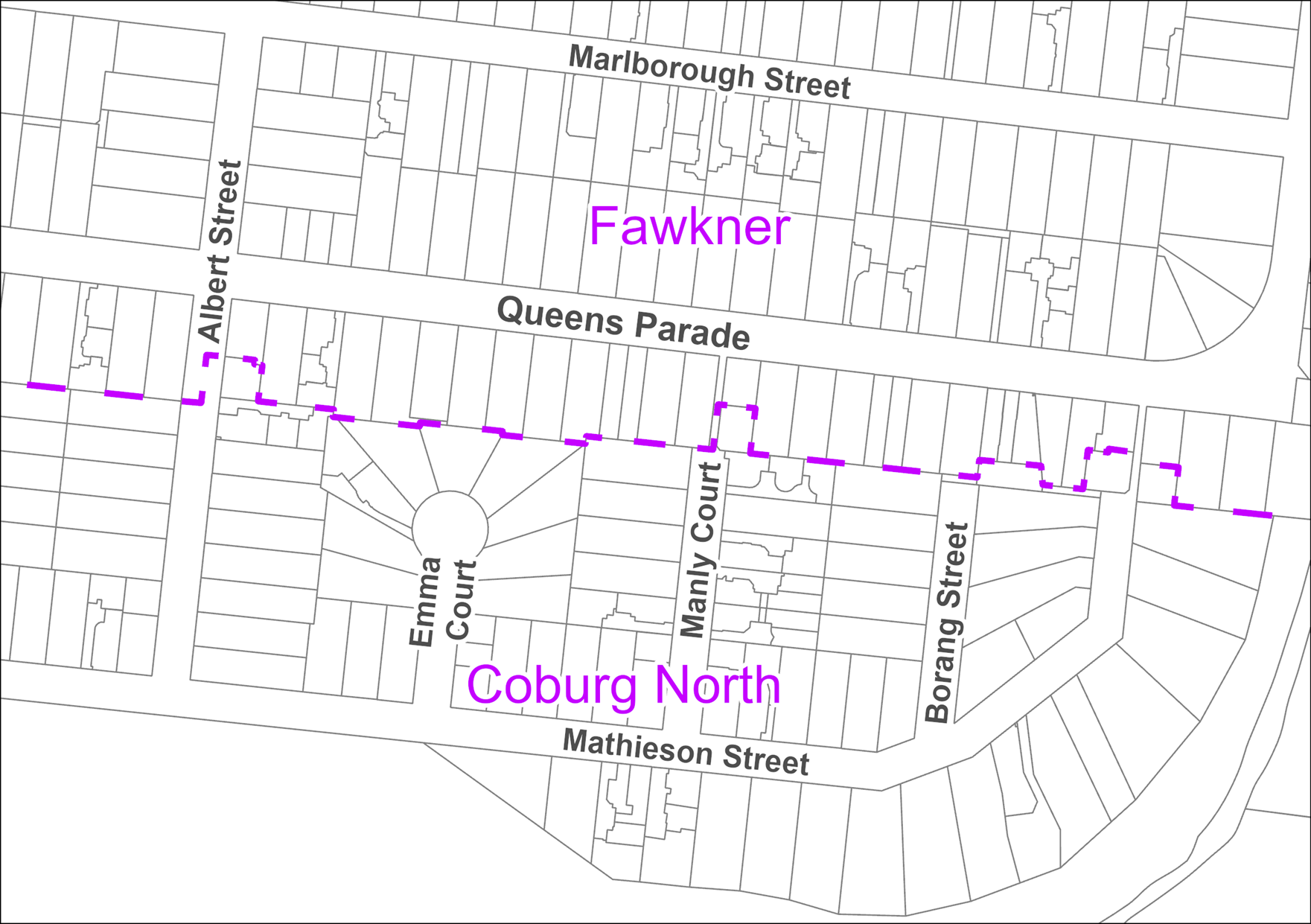 Map of Fawkner and Coburg North streets divided by a magenta dashed line, including the horizontal streets Marlborough street, Queens Parade and Mathieson Street; and the vertical streets Albert street, Emma court, Manly Court and Borang street.