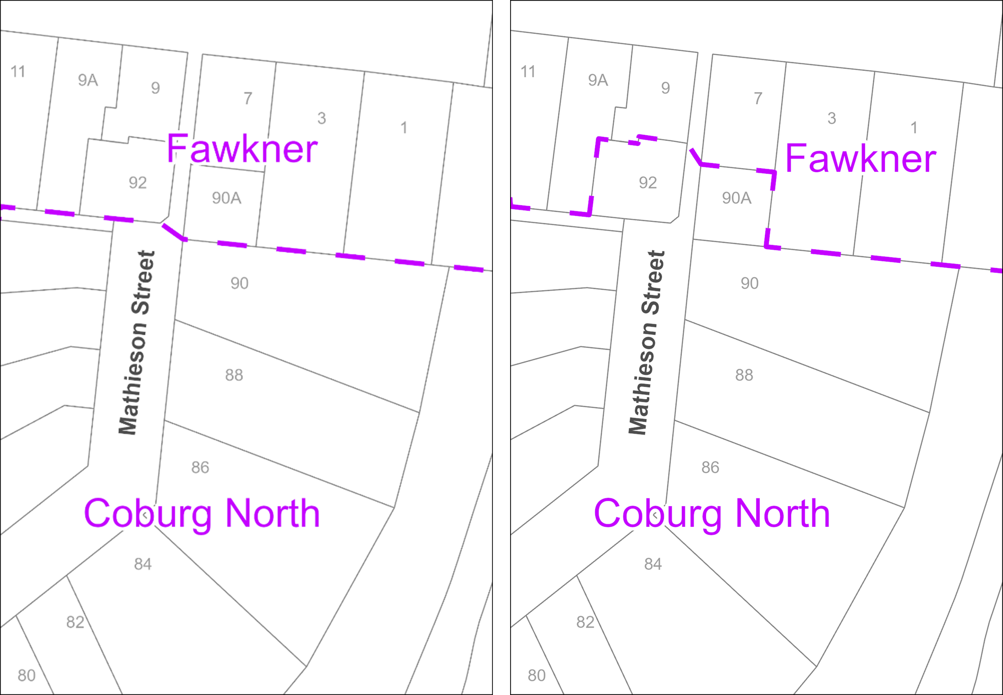 It currently runs at the rear of properties historically facing Queens Parade Fawkner, and several properties adjoining this boundary have been built with access from roads attributed to Coburg North instead.